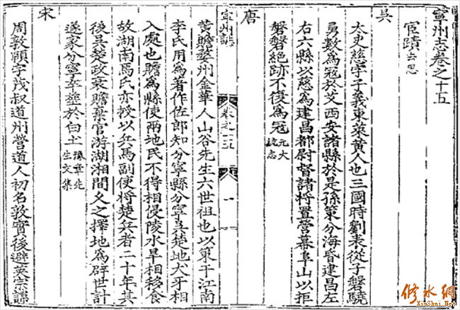 据《嘉靖宁州志》:黄赡,婺州金华人,山谷先生六世祖也。以䇿干江南李氏,用为著作佐郎,知分宁县。分宁,吴楚地犬牙相入处也。赡为县,使两地民不得相侵陵,水旱相移食,故湖南马氏亦授以兵马副使,将楚兵者二十年。其后吴楚政衰,赡弃官游湖湘间。久之,择地为辟世计,遂家分宁。卒,葬于白土。《豫章先生文集》。