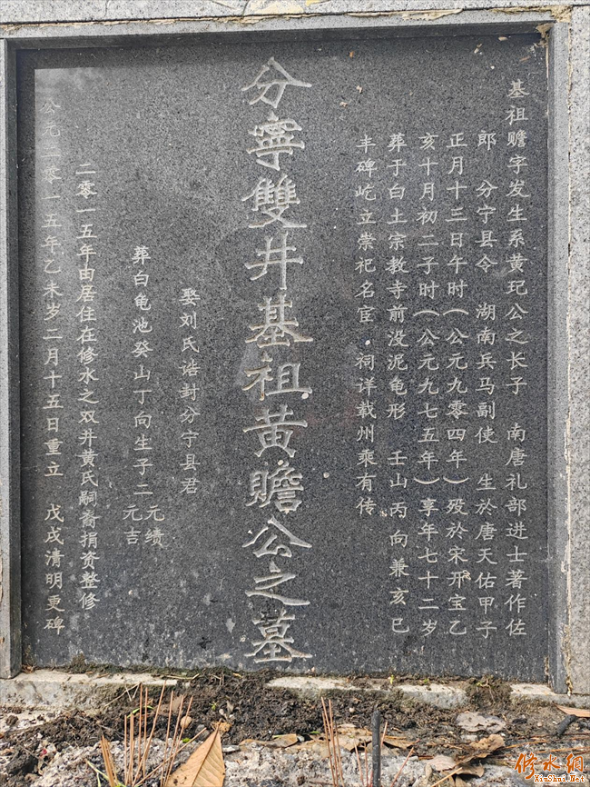 黄赡(904-975),字明远,号发生。黄玘长子,原籍婺州金华玉板桥。南唐时授著作佐郎,知洪州分宁(今修水),“念山川深重,可以避世,遂家焉。”即于南唐升元己亥年(939年)奉二亲携兄弟来分宁居住,黄赡是黄庭坚家族始迁分宁(今修水)的决策者。 ![]() 黄赡,生于唐天佑元年甲子(904年)正月十五日午时,殁于宋开宝八年乙亥(975年)十月初二日子时,享年七十二岁。 ![]() ![]()