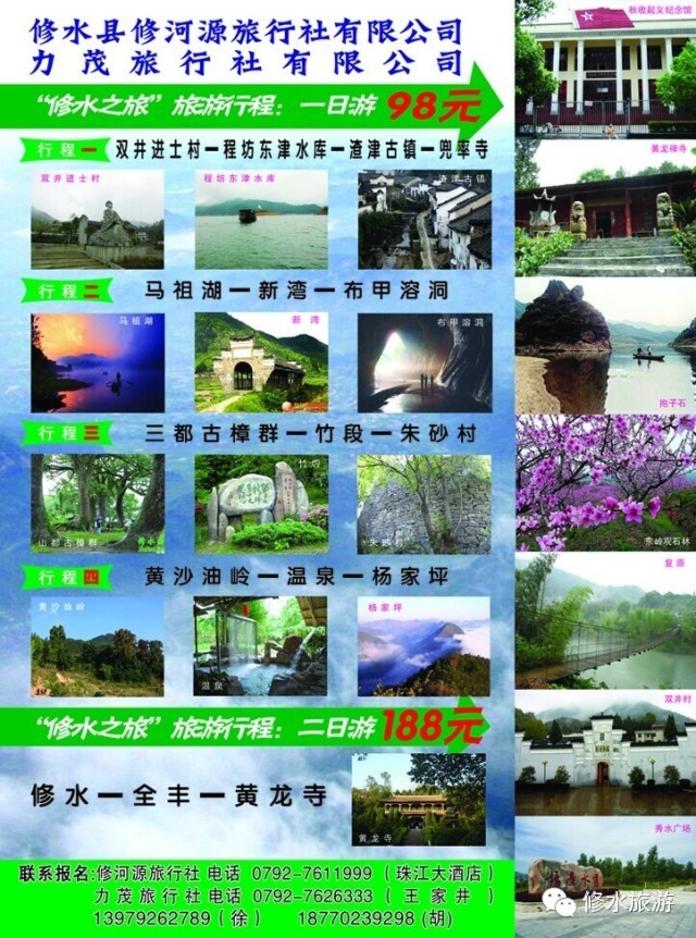 本次活动前期由于天气原因导致延期,本月30日晚七点活动宣传晚会将在联盛广场火热启动,欢迎大家前去观看,届时不仅有好看的节目,还有重量级的奖品哦! 一、活动主题和宗旨 内容来自xiushui.Net 主题:修水人游修水活动 宗旨:为满足旅游者的需求,加强旅游企业精品意识,方便广大城乡居民出游,“让外地人了解修水,让本地人了解新修水”。通过此次活动让修水人了解修水,充分营造本地游氛围,完善修水旅游环境、预热修水大旅游。 二、主办单位 主办单位: 修水县旅游发展委员会 独家冠名:修水县瑞达汽车驾驶员培训有限公司 协办单位:修河源旅行社、力茂旅行社、修水网、修水摄影协会、修水商报、修水论坛、户外修水人、登山协会、越野自行车协会 修水网 1、11月30日举办盛大晚会 时间:11月30日晚19:00-21:00 地点:联盛广场 晚会内容:歌曲、小品、舞蹈、抽奖 晚会中既有丰富精彩的节目,还会进行一个个激动人心的抽奖环节。欢迎大家积极参加,说不定下一个幸运儿就是你了。 一等奖由瑞达驾校提供的两名价值3000元驾照报名费全免 ; 二等奖由修河源旅行社与力茂旅行社提供的价值2600元4名免费香港澳门双卧6日游; 三等奖由本次活动组委会提供的15名免费修水一日游。 2、12月2日举行首发仪式 时间:12月2日早8:00 地点:联盛广场 行程安排:一日游4条线路由游客自行选择,另安排一条特色二日游的行程(修水-全丰-黄龙寺):户外、帐篷、野炊、篝火晚会相结合。 3、修水人游修水主题摄影大赛 摄影大赛贯穿整个活动中,可以拍摄晚会、也可以拍摄现场报名场景和旅游中的任意场景。 (1)参赛的作品必须在“修水人游修水”活动途中拍摄,规格、摄影器材不限(小数码,手机亦可),作品能反映生活,捕捉美好瞬间,宣传修水美景为主旨。 (2)奖项设置:设立一等奖1名,二等奖2名,三等奖3名,优胜奖若干名。 (3)获奖作品将在修水主流媒体展示。不另付稿酬。 (4)投稿要求:作品构图美观,未加工,可以是单幅或组图,JPG格式,并注明“作品名称、拍摄地点、作者姓名和联系电话”。发送至826620359@qq.com邮箱。截稿时间为2014年12月30日。 xiushui.Net |