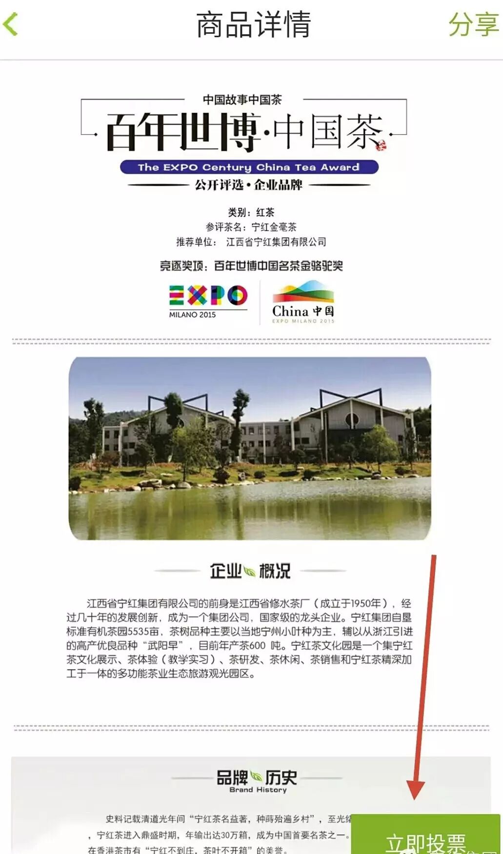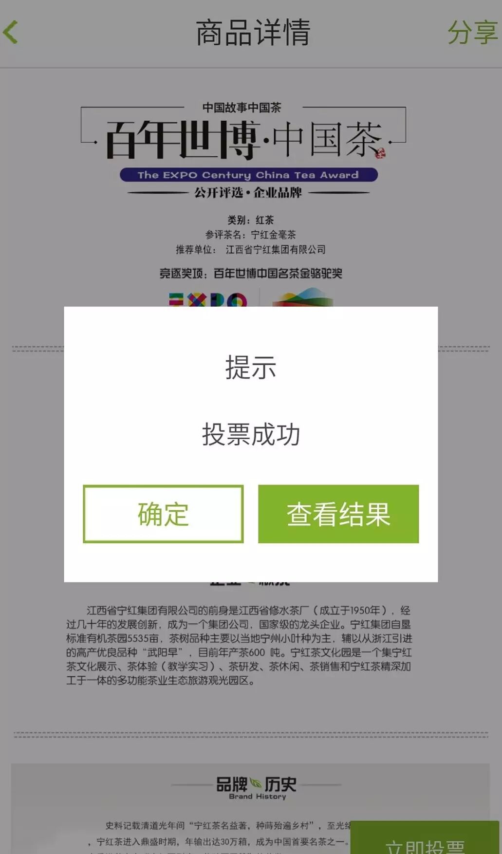 第五步:投票成功!别忘了返回选择“地区品牌”-“江西”再次给国茶宁红投票哦!