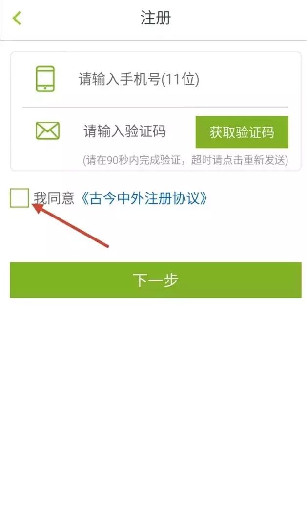 第一步:在注册页面输入手机号码,并点击获取验证码,收到短信后输入验证码。