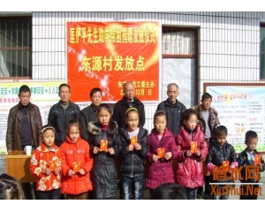 图为在东源村助学校园现场 12月10日,东港乡关工委争取了四特酒总经销匡俨平老板及顺德家私厂何友志先生支持,在中学本部、东源...
