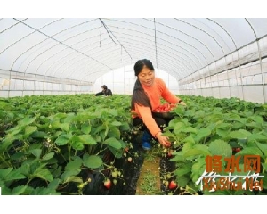 12月18日,杭口镇双井村的项小增在自家草莓大棚内采摘草莓。今年项小增利用该村荒地种植了15亩牛奶草莓,在获得建造塑料大棚的补...