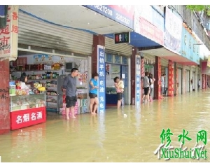 县城宁红大道三中路段商店全部被淹。(记者 朱彩源 摄)...