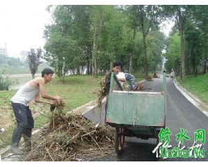 马家洲公园管理人员及时清理被洪水冲下的杂物。(记者 朱修林 摄)...