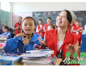 5月26日,九江市浔阳区的义工和东港乡桂坳村小学的学生一起开心地唱着歌。当天,由九江市浔阳区义工联合会组织的携手育桃李,让...