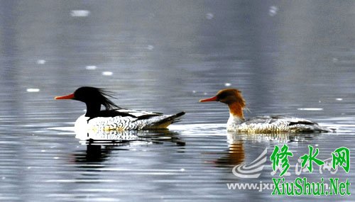 人们痛恨黑手、担忧它们不再光临时 中华秋沙鸭再现修水 记者长时间伪装蹲守终获其丽影 本报记者藏在迷彩棚里拍摄中华秋沙鸭。胡...