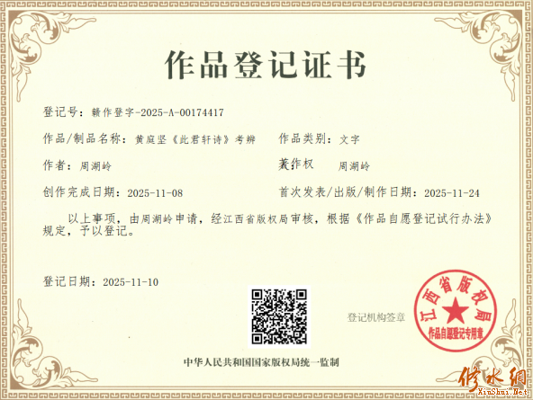 黄鹂啼破烟芜, 蔷薇暗度春路。 问风春向谁边渡? 风卷残香入云岫。 举首听千啭, 清音皆如故。 若能唤得春回步, 唤取归来同住。 春归何处? 谁将流光裁作絮? 逐风去,无归处, 长梦泛舟武陵浦。 燕绕雕梁, 苔痕深锁朱门户。 墨未干,愁已凝, 霜毫难写眉间绪。 春归何处? 青丝偷换岁华暮。 留不住,凭谁诉? 孤月清辉浸庭芜。 花落幽径, 苍枝残照故园路。 昔年挽,东君负, 浮生如絮逐风舞。 春归何处?蔷薇风里香依旧。 春归何处?黄鹂千啭音如故。 春归何处?心有清欢春自驻。 春在眉间心上住。 结 语 以所收集历史文献为基础,通过文献内证与实证考据结合,对黄庭坚《此君轩诗》的核心问题展开系统梳理与辨明。首先明确了《此君轩・答王周彦诗卷》诞生于1095—1101年黄庭坚贬蜀期间,专为荣州祖元禅师及从弟王庠(字周彦)而作,形成“寄王周彦单首本”与“赠祖元禅师草书和韵本”两大版本;原刻石因北宋“元祐党禁”遭毁,中国国家博物馆藏宋拓本为现存唯一原拓本,1976年确认为国家一级文物,成为追溯诗卷原始风貌的实物凭证。 修水网 www.xiushui.Net 其次,完整还原诗卷自南宋至民国的流传脉络。南宋陆游于1174年在蜀地得旧石本拓,跋文记载原刻被毁史实;史季温著《山谷别集注》完善黄诗“任渊注《内集》、史容注《外集》、史季温注《别集》”的“三家注”体系;文天祥题跋盛赞其“诗如李杜、书如颜柳”,誉其有“岁寒松柏之气”。元代袁桷高价收藏诗卷,柯敬仲、杨载、袁珙题跋分别赞其书法“气吐烟云,神拂星斗”“笔法妙绝,优入神品”“夺天工之妙”。明代王世贞从楚地获诗卷,计划请周天球双钩入石。清代张望于1794年题跋称诗卷“形神毕完”,周彦1830年得卷后请郭尚先鉴定,郭氏誉其为黄庭坚书法“最完善者”,后周彦将诗卷刻碑于鄱阳荐福寺碑林;光绪年间荣县孝廉刘镕得赠祖元禅师诗的白布朱拓本,然未钩摹上石,民国时失传,全程呈现“流传有序”的清晰轨迹。 再者,以《此君轩诗》为线索,钩沉北宋士人交往与文化互动脉络。苏轼作为王庠侄女婿,为黄庭坚、王序二人结识搭建桥梁;黄庭坚存与王庠13封书信,围绕文学创作、治学展开深度交流;围绕“此君轩”形成五首唱和诗(黄庭坚三首、王庠两首),精准厘清“黄庭坚《此君轩・王师学琴三十年》(原作)→王庠《此君轩和诗・竹君久要巳忘年》(初和)→黄庭坚《此君轩・此道沈霾多历年》(再赠)→王庠《此君轩和诗・鸣凤览德来纪年》(再和)→黄庭坚《此君轩・岁行辛巳建中年》(送别终作)”的创作时序,纠正此前诗作年代记载混乱的认知,同时印证北宋跨区域出行(如荣州至黔州、荣州至惠州)的艰难,及士人“以文会友、以道相契”的精神特质。 修水网 www.xiushui.Net 更重要的是,黄庭坚的《与王序》诗书,浓缩了他的文学观:学古是路径(溯六经之源)、文质是标准(匹配德行)、活学是方法(慕神非仿形)、去功利是目标(超世拔俗)。这套思想既纠正了宋代文坛的浮躁风气,也为后世文人提供了“学古不泥古、修德即修文”的实践方向。 本文的考证,不仅为宋代文人唱和文化、士人交游史研究提供实证,更以“文献记载—文物遗存”互证的方式,夯实《此君轩诗》相关研究的史料基础。《此君轩诗》及其流传史,既是黄庭坚贬谪生涯中精神坚守的具象载体,也是宋代文人风骨与文化传承的鲜活缩影,为后世理解古典文学的生命力与传承逻辑提供了重要参照。 (2025年11月8日) ![]() |