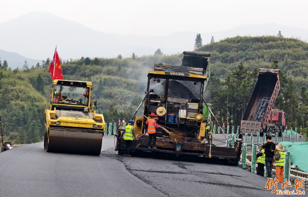 秋高气爽,天朗气清,正是公路建设的黄金窗口期。在G353线武宁罗溪至修水黄沙公路改造项目(修水境内)施工现场,摊铺机、双钢轮压路机等大型机械轰鸣作业、有序推进,施工人员分工协作、干劲十足,滚烫的沥青混合料经碾压后形成一条油黑铮亮、平整密实的路面,尽显火热建设氛围。