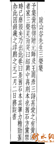 跋山谷先生三荣集,予集黄帖,得赠元师及王周彦三诗,甚爱之。有黄淑者,家三荣,见而笑曰:绍兴中再刻本也,旧石方党禁时已磨毁矣。乃出此卷,曰:是旧石本。其笔力精劲盖如此,因录藏之。淳熙之元二月二日,务观书。