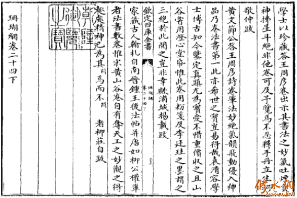 | 元代 | 柯敬仲 | 元代(1290-1343) | 题跋赞诗卷书法“气吐烟云,神拂星斗,绝非他卷可及” | 《珊瑚纲》 |