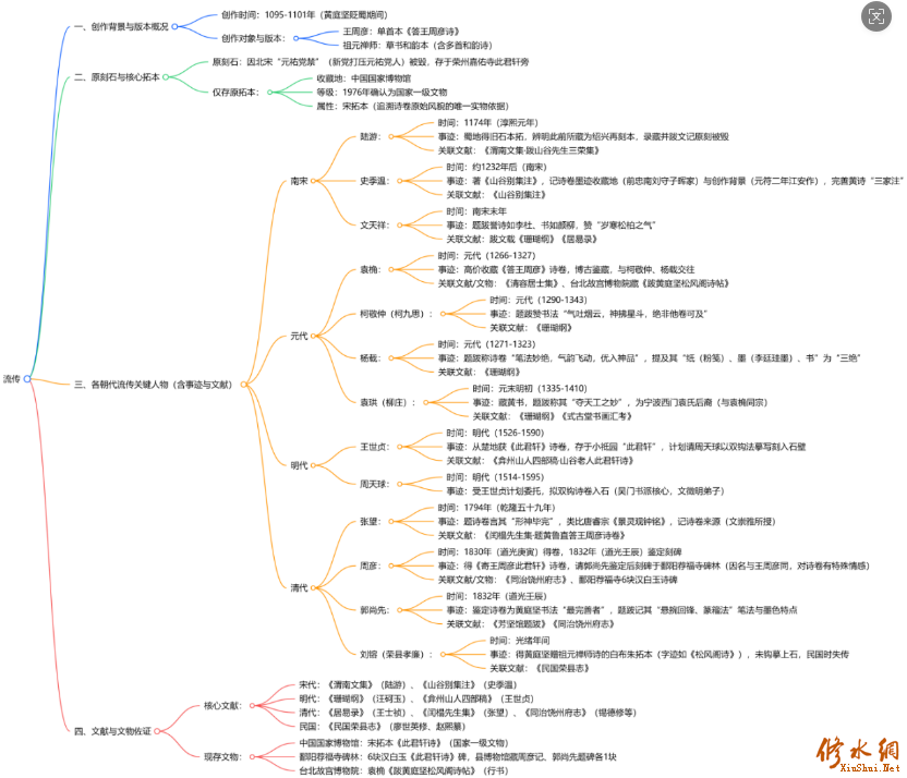 | 南宋 | 史季温 | 约1232年后(南宋) | 著《山谷别集注》,录诗卷墨迹收藏地(前忠南刘守子晖家)与创作背景(元符二年江安作),完善黄诗“三家注”(任渊注《内集》、史容注《外集》、史季温注《别集》) | 《山谷别集注》(存“忠南路”解读误差) |