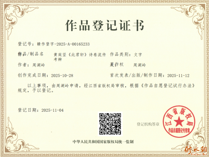 墨迹今藏于前忠南刘守子晖家。元符二年自黔移戎留江安作。
